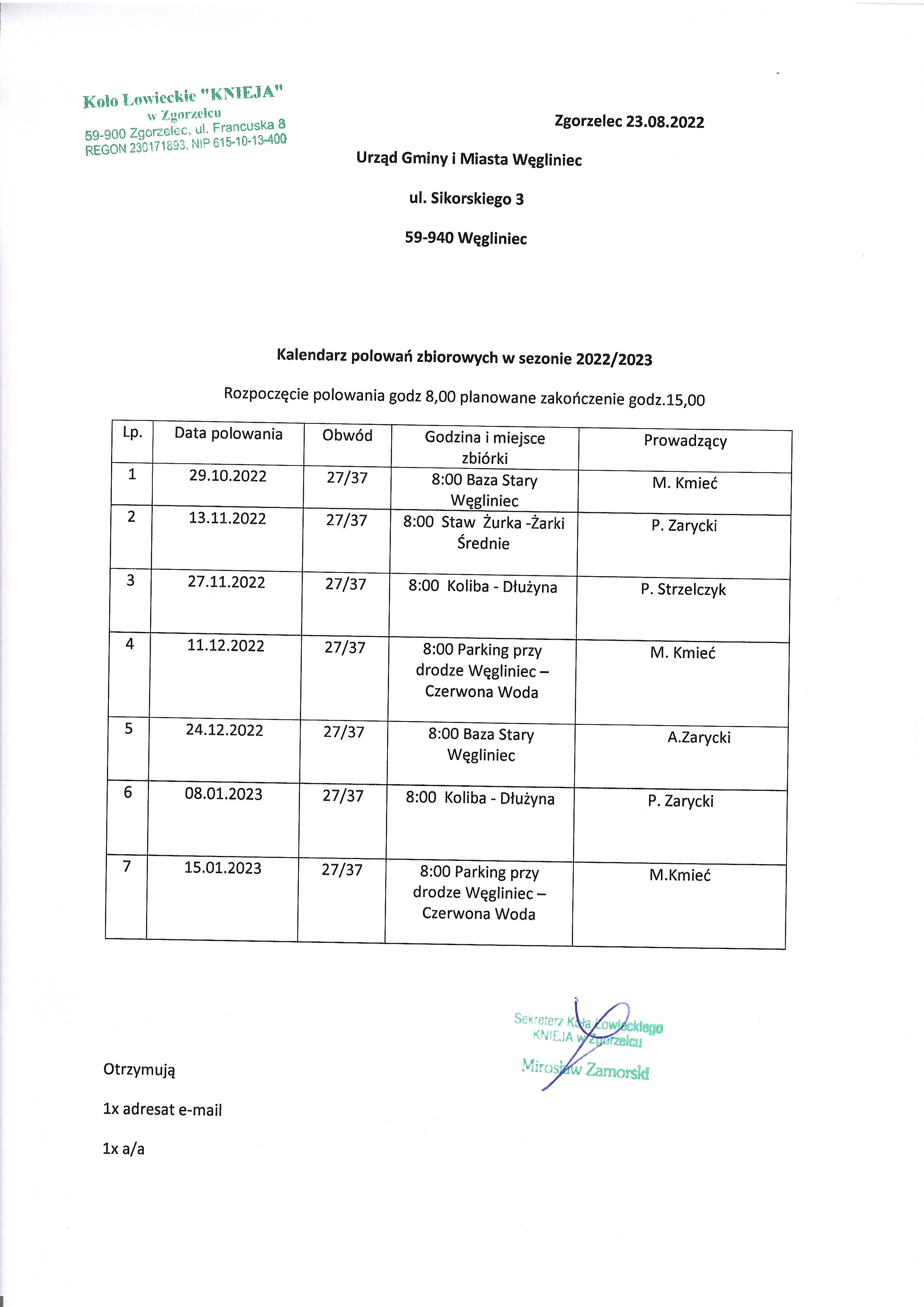 Dotyczy: Terminu polowania zbiorowego Interwencyjnego Koła Łowieckiego Knieja w Zgorzelcu sezon łowiecki 2025/2026