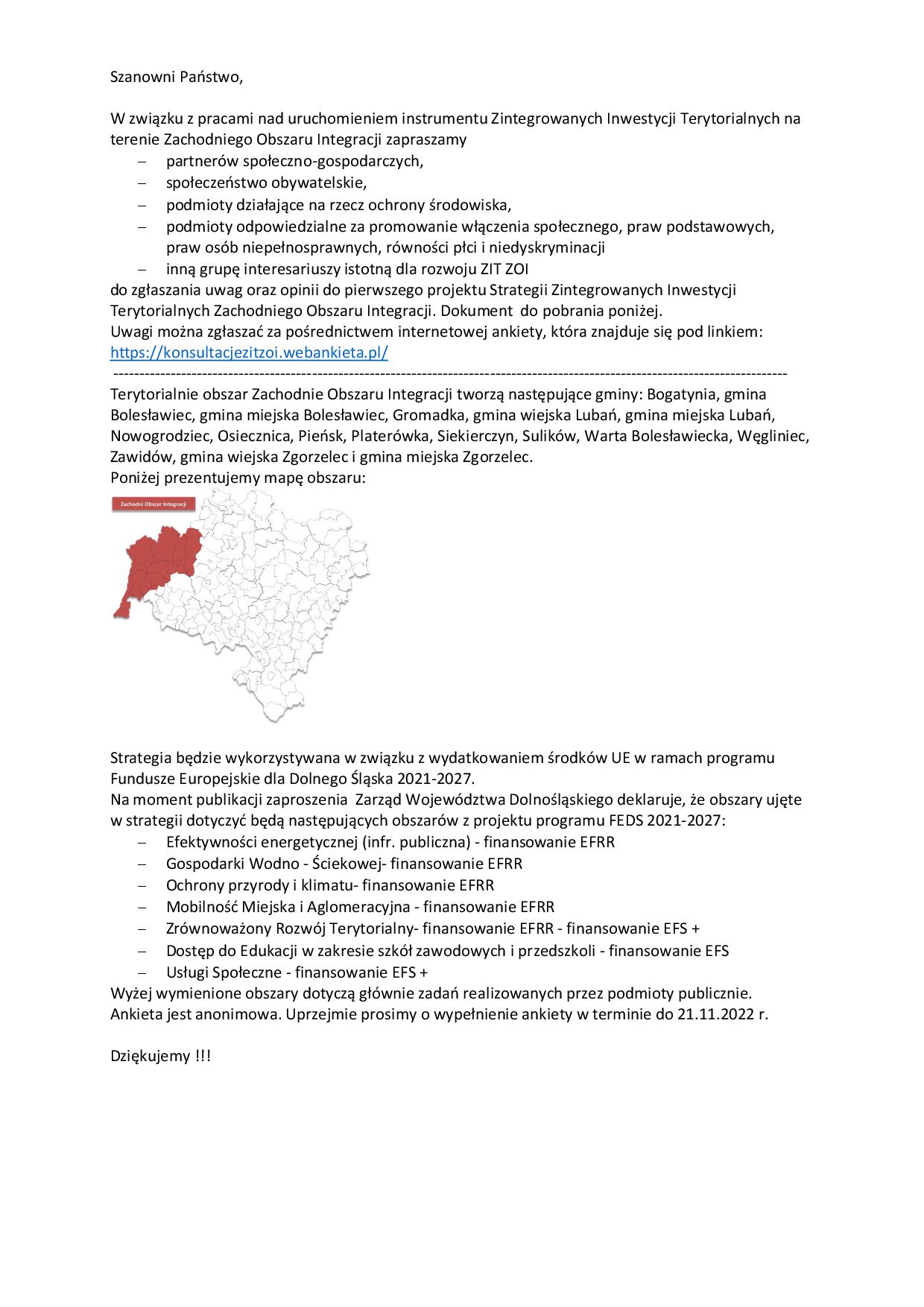 Dotyczy: Konsultacje społeczne do projektu zmiany Strategii Zintegrowanych Inwestycji Terytorialnych Zachodniego Obszaru Funkcjonalnego na lata 2021-2027