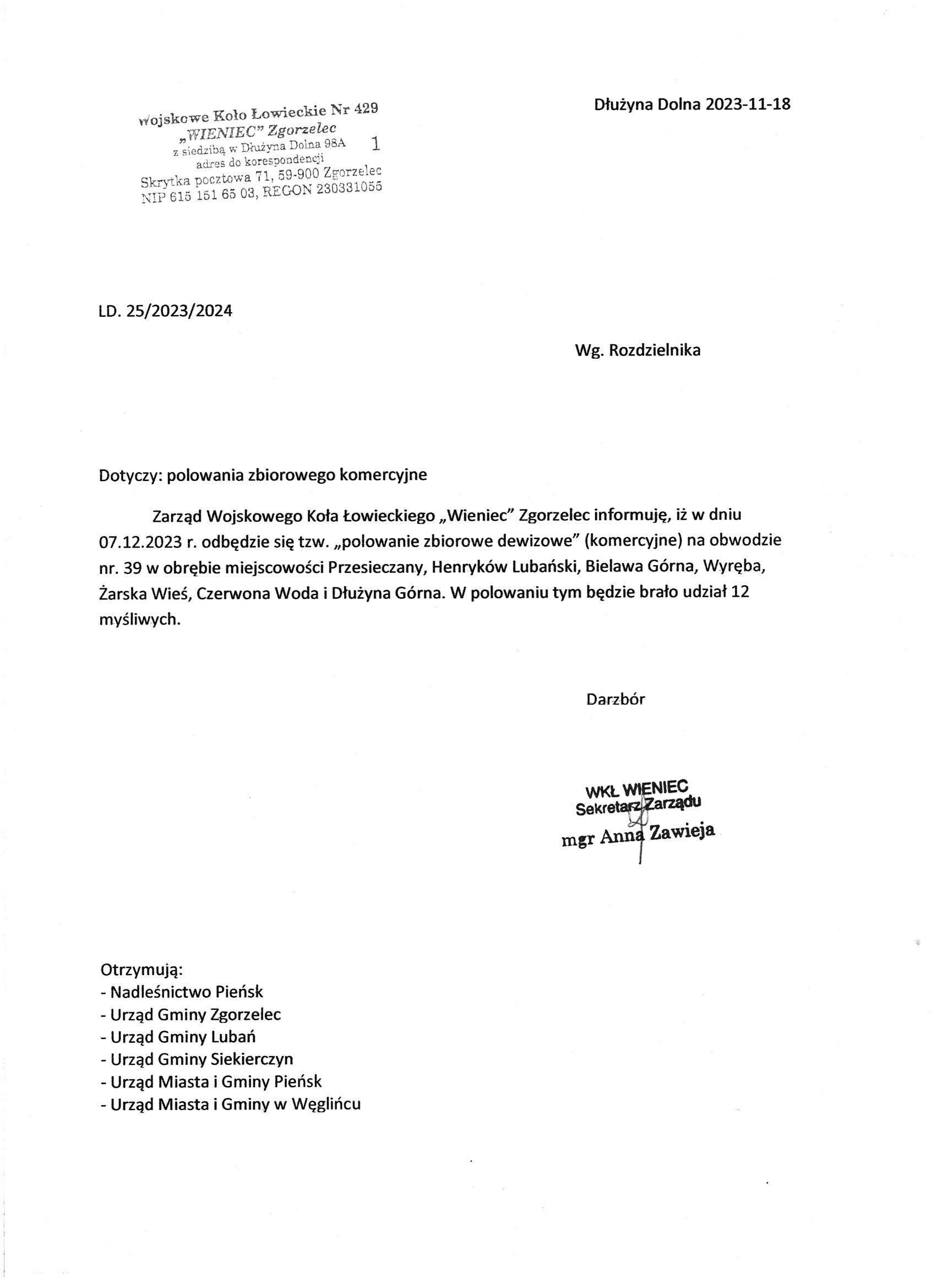 Dotyczy: Informacji o polowaniu zbiorowym Koła Łowieckiego „Piętnastka” w obwodzie 28 Węgliniec.
